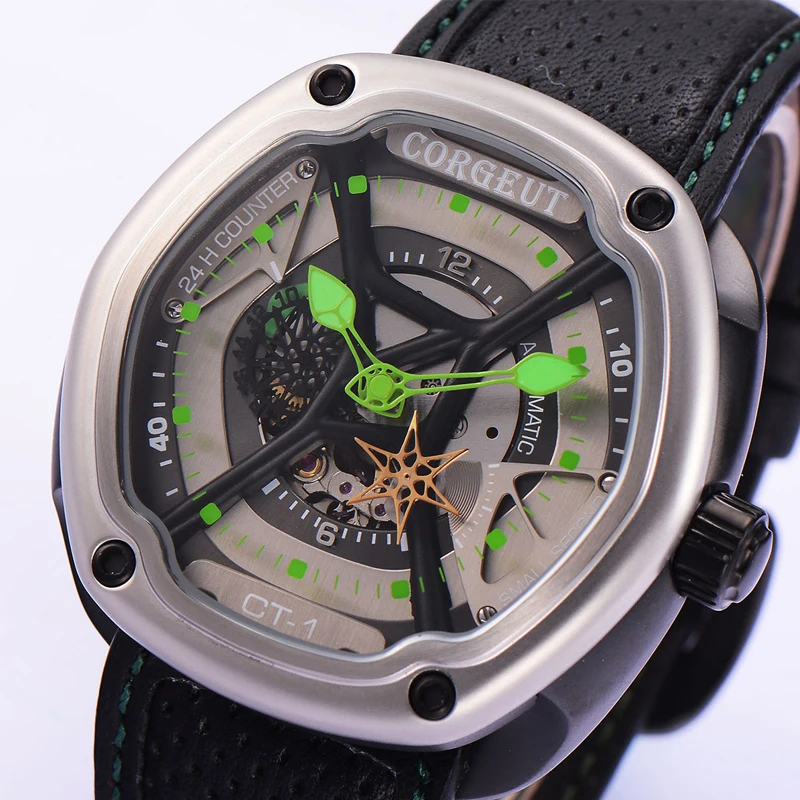 BEST SELLER Corgeut 46mm Fashion Sporty Black Strap Mechanical watch Gray face black bottom cover Green hands M